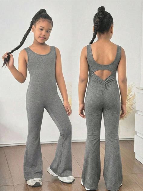 Tween Girls Fashion Streetwear Solid Knit Sleeveless Backless Cropped Cami And Flare Leg Pants, Casual Jumpsuit, Bell Bottom Jumpsuit Kids, Bell Bottoms Girl,12Y